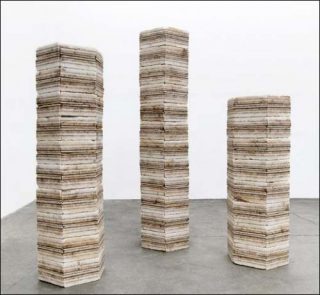 Ces trois Å“uvres sont en effet des colonnes dont les briques de sel proviennent du salar d’Uyuni. Ce désert de sel, le plus vaste du monde, situé sur les hauts plateaux de Bolivie, représente un tiers des réserves de lithium de la planète, encore largement inexploitées mais qui devraient dans les prochaines décennies en faire le principal site de production de ce métal. Le lithium y est surtout concentré dans la saumure, solution aqueuse salée, qui se trouve sous la couche de sel de surface. Ce sont justement des blocs extraits du sol pour creuser ces bassins que Julian Charrière a récupérés, taillés et empilés pour construire ces totems de l’ère digitale, dont le lithium, composant des batteries des appareils électroniques, est un élément clef. Assemblés, les blocs de sel évoquent des strates géologiques, et le temps écoulé nécessaire à la formation du lithium.