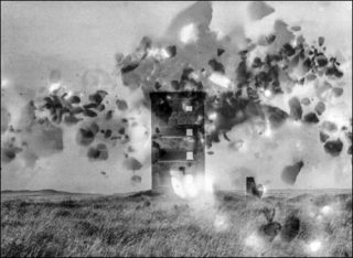 Alternant plans de jour et de nuit, la vidéo Somewhere dévoile dans ses longs travellings silencieux la steppe hautement irradiée et inanimée du polygone, parsemée de structures de béton jadis construites pour étudier les effets du souffle nucléaire. Ces monolithes désormais inutiles, qui ont résisté à des centaines d’explosions nucléaires, sont appelés à devenir les monuments involontaires de l’ère de l’atome, gardant trace de celle-ci même une fois qu’elle sera révolue.