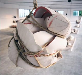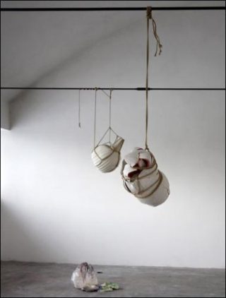Si la série d’œuvres intitulée Polystyrene met en œuvre un matériau contemporain, minimaliste et hautement inflammable, en inversant les rapports du vide et du plein — notamment parce que le polystyrène contient 98 % d’air —, la série Shibari se compose, en revanche, de récipients plus traditionnels, voire archaïques, même si, l’artiste leur inflige, à ce titre, un traitement tout à fait particulier. Car, comme leur titre ne l’indique qu’à un public plus ou moins averti, ce terme japonais signifie «lier».
