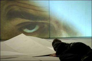 Après un rapide échange de plaisanteries, la scène absorbe le regard de tous. Le metteur en scène devenu danseur apparaît dans un coin du cube laiteux et déformé qui l’accueille. Il va successivement s’envoler, s’ébattre à la surface de l’eau, s’enfouir dans le sol. Parfois la scène l’avale, parfois la vidéo l’étale sur toute la surface du mur. Cette vue sur paysage humain et singulier laisse pourtant la place à la trajectoire, passage du temps, pas qui s’éloignent en crissant sur les graviers de rivière. La tentative est belle mais l’ennui est capable de se glisser furtivement dans les failles d’une présence parfois chancelante.