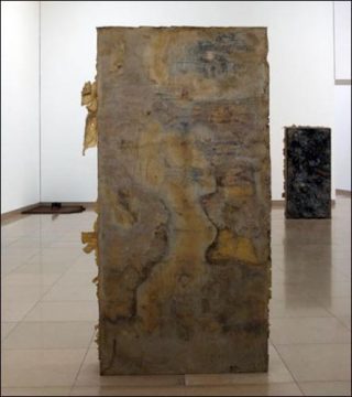 D’autres artistes, dont Guillaume Leblon, se réfèrent à la tradition de la sculpture américaine conceptuelle et matérialiste des années 60-70. Dans ses deux stèles massives en fonte, Sand Rise West 1 et 2, sortes de ruines modernes presque monochromes, à la surface sableuse faite de débris et de coquillages, Guillaume Leblon utilise à nouveau le sable, poursuit ses investigations sur la dimension paysagère, et affirme une approche subjective de la matière: «Mon dernier travail était un baiser fusionnel. La coulée du métal sur le sable d’une plage non nettoyée est clairement érotique, une fusion entre deux matériaux dont la rencontre est improbable. C’est un baiser, deux matières qui s’embrassent».