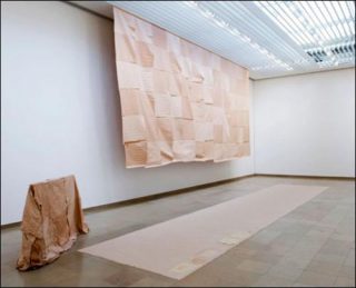 — Karla Black, Division Is, 2010. Papier, peinture, polystyrène, fond de teint. 145 x 260 x 70 cm.