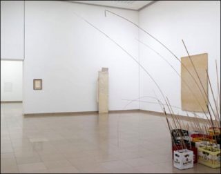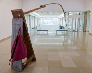 L’une et l’autre composées de débris mis bout à bout, et mettant l’accent sur l’utilisation de matériaux pauvres: des cagette en plastique, remplies de bouteilles de bières vides dans lesquelles sont plantées de grandes tiges en bois assemblées au moyen de sparadrap.