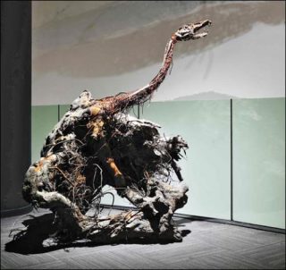 Lionel Sabatté. Le cygne noir prend source d’une image marquante de mon enfance à savoir le naufrage de l’Amoco Cadiz. J’avais envie de créer un oiseau mazouté qui pourrait tout aussi bien renaître de ses cendres tel le phoenix. On retourne ici au fantasme du monde imaginaire. Par la suite j’ai pris connaissance du concept de cygne noir élaboré par Nassim Nicholas Taleb. Il désigne les limites de la pensée analytique rationnelle et de la capacité prévisionnelle de la pensée humaine. Pendant très longtemps on croyait qu’il n’existait que des cygnes blancs. Tout fut remis en question par la découverte, il y a peu, de l’oiseau noir en Australie. On évolue dans une société dans laquelle nous nous prémunissons de moins en moins contre «les cygnes noirs» car nous les négligeons dans nos prévisions, alors qu’ils demeurent inévitables, et les conséquences sont désastreuses. Dans une autre acception de ce concept il existe «les cygnes noirs positifs» qui seraient des formes auxquelles on ne s’attend pas et qui pourtant demeurent inscrites dans la genèse de la pratique. Pour moi il s’agit en quelque sorte de les rechercher.