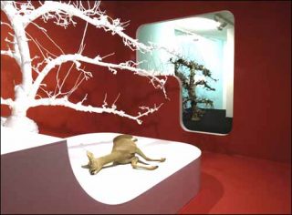 Tout à ses gestes esthétiques, l’artiste sépare Powered by Zero en deux scènes : une rampe érigée sur laquelle trône un pommier peint en blanc et aux six branches parallèles. Juste en-dessous, la dépouille d’une biche avec, à la commissure des lèvres, une mare de perles roses.