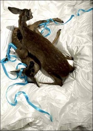 Architecte de formation, Boerre Saethre a remodelé les locaux de la galerie Loevenbruck en deux pièces séparées par une ouverture toute en rondeur et dont les murs ne sont plus que couleurs et aplats : rouge sang pour la première et turquoise pour la seconde. Tout à nos visions chromatiques, la découverte d’un cadavre de biche allongé est une surprise de taille!