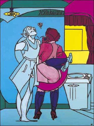 Ces variations autour d’un même thème, le couple, s’intensifient et prennent une épaisseur expressive par un recours à l’artifice. Celui des couleurs, d’abord, dont la saturation et l’intensité parfois quasi phosphorescente ne sont prélevées dans aucune réalité extérieure et qui apportent, par leur forte présence, une humeur, une tonalité psychologique au dessin. Les accessoires ont également leur importance dans la construction de ces allégories : radiateur, téléphone, bicyclette, ventilateur et sac à main occupent l’espace avec autant d’aplomb que les personnages.