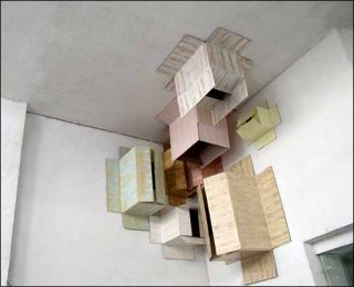 Plus loin, Isabelle Ferreira détourne aussi l’usage du matériel qu’elle utilise. Avec ses briques, elle réalise Chariot, une architecture instable, vide et comme friable. Ailleurs, des cartons investissent le plafond et la verticale des murs.