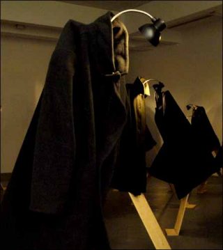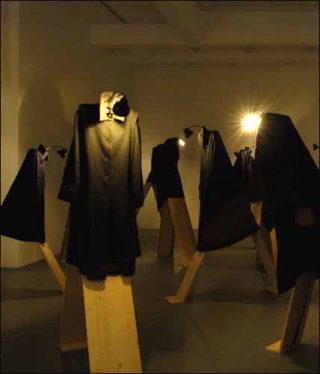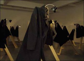 L’effet est saisissant. Dans la pénombre, une foule anonyme se presse. Les trajectoires se croisent et s’évitent. Avec, en guise de têtes, des lampes de chevet au long col, tournées vers le sol, les silhouettes efflanquées ont le pas ample et le buste incliné par la hâte. Ces clones stylisés de M. Hulot, qui auraient troqué leurs gabardines claires contre de sombres manteaux d’hiver, évoquent la multitude grise des métropoles. Mais l’anonymat en est troublé par des prises de paroles inopinées, déclenchées par le passage du visiteur : «Je suis faible», «Je suis lucide», «Je suis travailleur», «Je suis jalouse», etc. Déclamations minimales qui éclatent comme des bulles, sans laisser de trace, tant sont vaines ces lapidaires revendications de reconnaissance individuelle.