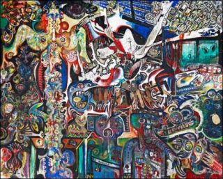 — Jean-Jacques Lebel, Enrico Baj, Roberto Crippa, Gianni Dova, Errò, Antonio Recalcati, Grand tableau antifasciste collectif, 1960. Peinture et collage sur toile, assemblage de divers éléments dont le Manifeste des 121, des coupures de presse, des médailles. 400,5 x 497 cm.