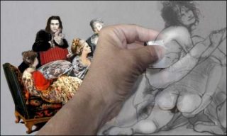 Le tabou de la représentation du désir et de l’érotisme se trouve également au centre des préoccupations du Théâtre pour la main de Danielle Schirman. Cette œuvre se conçoit comme un livre à manipuler rendant hommage au libertinage du XVIIIe siècle et du Marquis de Sade. Cet ouvrage, entamé il y a vingt-cinq ans par l’artiste alors qu’elle étudiait aux Beaux-Arts, avait été laissé inaccompli. A la demande de Jean-Jacques Lebel, Danielle Schirman a ainsi repris et achevé ce projet. La main actionne des languettes, comme dans les livres pour enfant, afin de déclencher des mouvements ou de dévoiler certains objets. Sauf qu’ici le contenu du livre est évidemment beaucoup plus osé, illustrant des parties fines dans des salons bourgeois. Les languettes servent alors à dévoiler les corps, à actionner la libido des personnages, afin d’incarner le désir sexuel en tant que tel, loin de tout angélisme ou de tout platonisme.