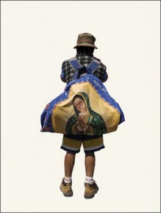 300 pèlerins ont été photographiés par l’artiste, puis détourés pour que ne reste qu’une silhouette de dos avec son précieux fardeau. Santons sans visages, mannequins occasionnels ou simples voyageurs porteurs d’un vaste écusson? Nul ne sait s’il n’est informé, car la dé-contextualisation voulue par l’auteur permet de s’attacher aux attitudes individuelles, à ces corps porteurs non pas d’une pénible et lourde croix mais d’une Vierge vénérée. L’accumulation des personnages, la beauté et l’étrangeté de leur harnachement, constituent une série exceptionnelle qui permet de visualiser la démesure de cette croyance, la beauté du geste et sans doute la métaphore du surréalisme mexicain.
