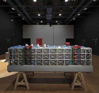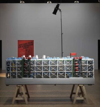 Ces chants ont été interprétés le soir du vernissage par des comédiens juchés sur des moulages de bornes anti-stationnement qui délimitent les abords de la Piazza. Ici, au nombre de cinq, elles cernent le cercueil, reproduction rudimentaire, mais fidèle du Centre, en carton vernissé, boutons, et bouteilles plastique. Les bornes sont tour à tour éclairées par des poursuites, qui signalent fortement l’absence des interprètes.
