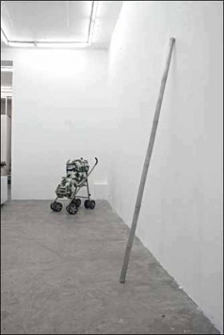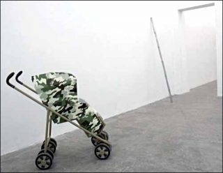 Bad Innovation in the Name of Protection se compose d’une poussette transformée en tank à roulettes. La poussette trône fièrement au centre de la salle, à l’épreuve de toute agression. Une façon pour Kristof Kintera de tourner en dérision la paranoïa qui, depuis le 11 septembre notamment, s’exacerbe en un désir de protection confinant à l’absurde.