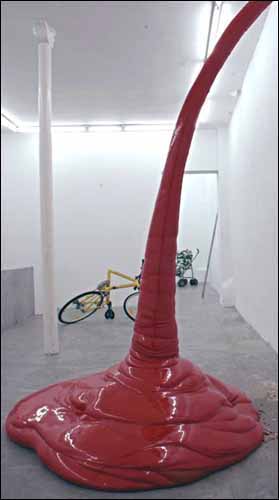 A plus de deux mètres du sol, une coulée rouge vif a percé le mur, laissant des débris au sol qui témoignent de la puissance supposée de ce jet. Red is Coming fait irruption de force dans l’exposition, sollicitant l’attention du spectateur par son incongruité et sa taille imposante.