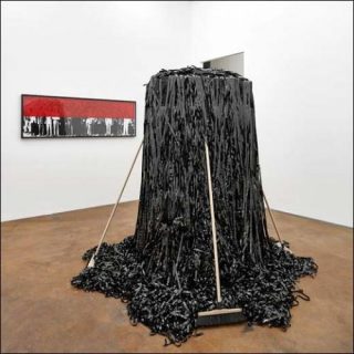 Deux photos de la série L’évolution ou la mort montrent de jeunes corps nus entourés de ceintures de livres retenues par du ruban adhésif imitant des ceintures d’explosifs. Elles désignent le savoir comme une possibilité d’évolution. Mais une violence sourde s’affirme dans chaque œuvre, motivée par un pessimisme particulièrement perceptible dans la pièce Les Ruines. Des ossements de deux squelettes éparpillés sur le sol sont poussés vers le mur par un balai surmonté d’un drapeau noir, tel le dernier acte d’une humanité aux batailles vaines.