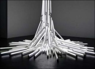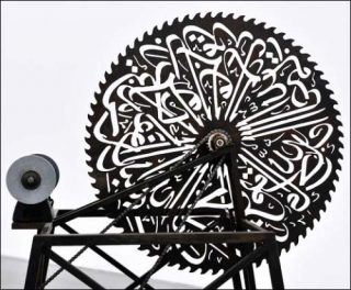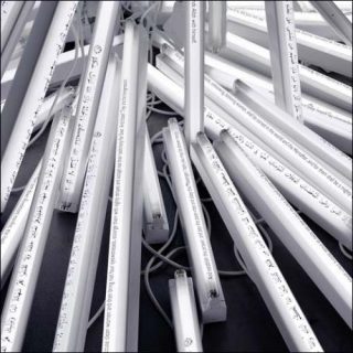 L’installation Commerciale, composée de bouteilles d’eau bénite empilées dans des chariots de supermarché matérialise le mince fossé qui sépare les institutions religieuses de leur dévoiement par la société de consommation. Dans la sculpture intitulée Jusqu’à preuve du contraire, une multitude de néons forment comme une coulée de lumière provenant du plafond et s’étalant sur le sol. La lumière qu’elle propage constitue un piège visuel: on doit se rapprocher d’elle pour pouvoir lire la sourate 24 du Coran inscrite en anglais et en arabe sur les tubes lumineux, mais l’œil est aveuglé et ne parvient pas à fixer les mots qui passent d’une langue à l’autre. Le texte reste imprimé sur notre rétine et se retrouve projeté sur ce que nous voyons. La lumière, émanation divine, devient ainsi un vecteur d’illusion. L’œuvre Dead Language met en scène la désacralisation du sens et du langage par des fragments de calligraphie emprisonnés dans un rouleau de fil barbelé présenté dans des vitrines en verre, comme des reliques qui devraient être protégées mais qui ont perdu leur signification.
