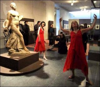 Vêtues de deux robes d’un rouge éclatant dessinées par une autre isadorienne, Catherine Gallant, les deux danseuses ont descendu, l’une après l’autre, pieds nus, les marches d’un épais béton qui conduisent au sous-sol du musée, où elles ont joué, parfois juré, et se sont mesurées aux œuvres bi et tridimensionnelles réunies par les commissaires de la manifestation.