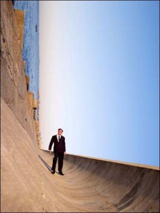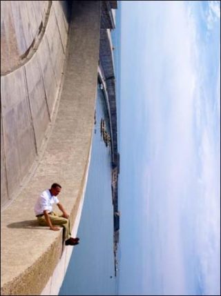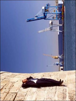 On peut tout d’abord être tenté de sourire face aux clichés de l’artiste, tant il semble miser sur l’absurde, le saugrenu. On le perçoit, l’air impassible, dans un panel de positions intenables: les semelles collées sur un palmier et le corps strictement perpendiculaire au tronc de l’arbre; en train de lire le journal au fond de la Méditerranée, comme si de rien n’était; ou perché en haut d’un escabeau comme s’il repeignant la surface de la mer; ou encore, marchant sur l’eau tel un messie. Les légendes de ses photographies font aussi preuve de traits d’humour grinçant, notamment avec le tirage Socle (Hommage à la mafia), où l’on perçoit Philippe Ramette les pieds pris dans un bloc de béton, au fin fond des eaux, à l’image d’une exécution crapuleuse.