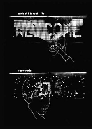 Lorsque la connexion se fait entre deux propositions (un baiser, la diapositive complémentaire, les silhouettes devant un décor…) elle n’est pas une solution qui fixerait l’état des choses : le processus recommence, il faut chercher toujours. Si l’on a été inattentif, il faudra « repartir de zéro ». Et même, après avoir attendu un tour de diapositives pour voir la phrase complète on se trouve face à une autre difficulté : « Mon corps pleure, il n’y a pas de mots ». Peut être des mots organiques ?
