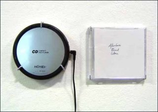 La deuxième pièce présentée (Sans titre, série CD et dessins encadrés en CD cover) fonctionne presque en négatif des partitions. Sur le mur, des lecteurs CD proposent quatre « tubes » (des chansons d’amour) en écoute individuelle. Sur le boîtier les titres, énigmatiques associations, invitent à recomposer pour soi des situations à partir de ces éléments (de l’après rasage, du coton, un homme blond, etc.). Et si l’on ne comprend pas l’allemand, le tête-à -tête avec un morceau très commercial n’est pas sans effet.