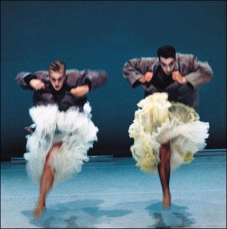 Dans ce duo d’exilés, prolongé l’année suivante par un second volet, Extasis, apparaît curieusement la somme des gestuelles que tous deux ont pu exhumer: ancrage expressionniste et contorsions carnavalesques de Pina Bausch, virtuosité technique de Viola Farber, formes angulaires de l’abstraction américaine, facéties de Dominique Bagouet… le tout refondu en un curieux pas de deux, où les notions de dualité (gémellité, androgynie, désir, jalousie) se déclinent sur la démesure berlinoise des musiques de Kurt Weill.