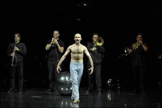 Il se contorsionne, se déshabille, se roule dans une jetée de fourrure. Il déplace des sphères, s’allonge au sol, gravit quelques marches. La nécessité du mouvement n’apparaît pas. L’homme réfléchi par un sol noir brillant est d’une élégance réelle, touché par une fragilité poétique, un peu chaplinesque lorsqu’il joue au chef d’orchestre et laisse paraître le ridicule de dominer la scène. Il fait malheureusement preuve d’une sensualité outrée, un peu fausse, un peu attendue.