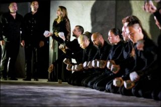 Jeux de projections et d’imbrications façonnent un fascinant rituel, sublimé par la rencontre musicale du groupe polyphonique corse A Fileta, de la chanteuse libanaise Fadia Tomb El-Hage et du percussionniste japonais Kazunari Abe. La musique est, comme toujours, centrale chez Sidi Larbi Cherkaoui: à travers elle, il nous rappelle ici qu’une composition peut avoir plusieurs sources, religieuses et séculaires, chrétiennes et islamiques. Plus largement, il nous suggère que les traditions sont les fruits d’imbrications, de croisements. Chacun des artistes présents sur le plateau apporte sa culture, sa voix et ses paysages, habitant en communauté la forteresse naturelle qu’est la Carrière de Boulbon pour laquelle la pièce est pensée.