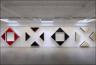 Il ne s’agit plus ici de toiles mais de volumes pleins, de caissons, que Buren apparente aux hauts-reliefs de la sculpture, et qui prolongent en quelque sorte les recherches des Cabanes. Ces nouvelles déconstructions cependant, ne visent plus à mettre en rapport — à situer — une œuvre dans des espaces architecturés, mais à faire advenir des œuvres elles-mêmes une architecture, ou à tout le moins une construction autonome. L’œuvre, en se déconstruisant, construit son propre espace en relief.
