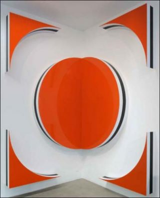 Cette déclinaison contredit le système esthétique dans lequel elle s’inscrit, elle renonce à sa situation tout en conservant sa visibilité: les hauts-reliefs «font» monument tant par leurs dimensions que par le miroitement de leurs surfaces satinées, par leur «puissant vortex chromatique», ainsi que l’écrit, pour cette exposition, Marie-Cécile Burnichon.