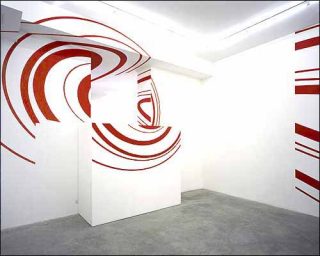 À partir d’un point de vue qu’il fixe, à la hauteur de ses yeux (162 cm), il crée une intervention picturale, de couleur rouge, de formes géométriques qui se distribuent sur les différents plans de l’espace. La forme est perçue cohérente à partir d’un point de vue — celui à partir duquel elle a été élaborée —, mais vue d’ailleurs, la forme se disloque et se développe en une infinité de configurations en fonction de la multiplicité des points de vue à partir desquels elle peut être perceptible.