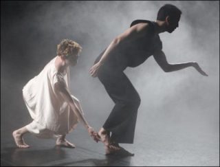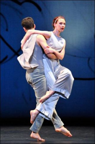 Tombées du ciel, deux danseuses acrobates en tutus de cirque s’épanouissent dans les airs musicaux de Pygmalion, comme dans les airs spatiaux du théâtre! Préambule à l’entrée en scène des danseurs «terrestres», ces fées volantes, comme portées par leurs propres rires, placent la pièce sous le signe de la légèreté et de la badinerie, nullement synonyme ici de superficialité. Créée en 2011, Les yeux et l’âme donne clairement au ballet XVIIIièmiste les très actuels accents de la poétique brownienne. C’est toujours l’énergie du «water motor» qui anime les danseurs, vaguelettes humaines vêtues de vaporeuses tuniques bleutées. La puissance aquatique du mouvement, tout en coulure maîtrisée, s’infiltre savamment entre les saltations joueuses, festives du menuet, donnant à la contredanse baroque une d(a)nsité nouvelle, liquide. Devenus signes, les danseurs dessinent une aquarelle de mouvements. Tout se passe comme si la calligraphie du fond de scène se détachait sous nos yeux de la toile pour tracer dans l’éphémère de la danse le tableau d’une âme…