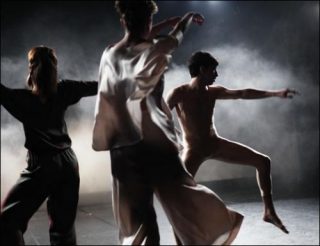 A l’atmosphère enjouée de cette pièce toute en allégresse et vivacité — joie de vivre et de danser des plus communicatives — succède Opal Loop. Et la transparence de céder au nuage, alors que dans l’obscurité, quatre silhouettes se détachent progressivement de ce voile d’eau qui émerge du fond de scène. Le silence se reforme dans la brume, uniquement troublé par les respirations devenues rythme. Nul mouvement d’ensemble à proprement parler dans ce quatuor hétéroclite — triton en combinaison chair, nymphe en flottante tunique vert-amphibienne, danseur en noir et son féminin pendant en blanc- mais une cohérence tacite, subtile. Chacun évolue comme isolé dans une solitude somnambulique… et pourtant, l’on perçoit d’invisibles réseaux qui relient, connectent télépathiquement ces mystérieux personnages. Le «corps de ballet» n’a ainsi de cesse que de se faire et se défaire dans d’aquatiques reflets opalins : duos réels et imaginaires qui se succèdent ou se superposent, sauts, torsions du buste, jet de bras et de jambes qui se répondent, membres qui se frôlent plus qu’ils ne se touchent, dans un langage muet. Les corps eux-mêmes se nouent et se dénouent, se contractant sèchement pour mieux s’étirer souplement, se replient lentement à terre pour mieux s’éployer dans un bond, suivant une boucle cinétique qui jamais ne se rompt.
