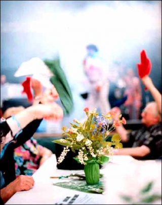 Ses réflexes ne sont pas des automatismes, ils ne tombent jamais dans le travers du procédé. Il privilégie le coin de table au reste de la fête, il fait de la partie un tout. Il laisse traîner des fils que l’on peut dérouler pour essayer d’avoir une vue plus complète : cette trame est autant imaginaire que narrative. L’image est d’abord vaporeuse, fuyante, puis elle se laisse rapidement comprendre. Un petit bouquet de muguet sur la table d’un banquet cache derrière lui une fête communale pour le troisième âge. Des rideaux cachent autant qu’ils laissent entrevoir, comme à travers le trou d’une serrure, la piste d’un stade d’athlétisme. Ce n’est pas un jeu de cache-cache, il n’y a pas de malice, mais juste le souci de présenter un monde où le spectateur peut apporter une voix au récit qui se construit devant lui.