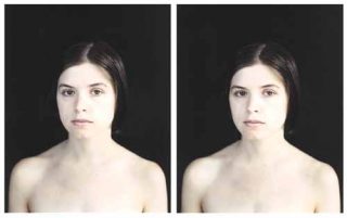 Les trois diptyques d’Isabelle Waternaux, les Écarts, confrontent deux portraits presque identiques de la même personne : alors que les yeux du portrait de gauche sont dirigés vers le spectateur, dans le deuxième portrait, le regard est tourné vers la droite. Seul ce léger mouvement des yeux, cette différence infime, permet de manifester une présence du modèle.