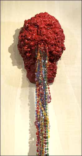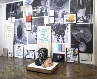 Son œuvre plastique foisonnante, faite de collages, de taches de couleur, de graffitis et de gribouillis, forme une expérience visuelle et délirante. Même noir ou jaune, le rire est partout, dans une installation géante de papiers, d’affiches et de cadres, dans trois toiles et dans des bustes humains, qui semblent avoir subi les assauts d’un sale môme à la peinture facile.