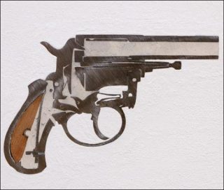 La seconde frise est plus surprenante. A première vue, on croirait simplement déceler quelques dessins tracés à même les murs, représentant un fusil, une pipe ou un revolver. En fait, il s’agit de véritables objets qui ont été scindés puis incrustés dans les murs du musée. Chaque objet a la particularité d’être traversé par une sorte de tuyau ou de vide. Le souffle du fumeur ou de la balle projetée hors du canon nous renvoient alors au souffle des chants lyriques, dont venons de faire l’expérience renversante il y a quelques instants.