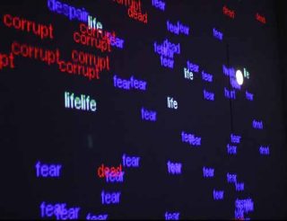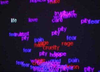 La pièce intitulée Rage Love Despair nous conduit à l’idée de vie et de mort, condition de tout organisme vivant. Les signifiants « life » apparaissent en blanc sur fond noir. Immobiles et solitaires, ils se contentent de clignoter. Des groupes de mots bleu, rouge et magenta viennent les encercler. Leur tremblement maladif, leur capacité à proliférer et à se démultiplier semblent menaçants. En rouge, couleur traditionnellement assignée à l’idée de danger, on lit « hate, cruelty, rage, suspicion… ». En violet, couleur de la passion, apparaissent les mots « pain, cold, fear, despair… » ; et en bleu, un registre à consonances plus tendres, sorte de moyen terme comme « hope », « pity », ou « trust ».