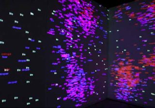 Un programme réalisé par Charles Sandison permet à un ordinateur de projeter des mots sur des éléments d’architecture. Dans la pénombre de la galerie, des mots luminescents se promènent tels des électrons libres sur les murs et créent entre eux des relations de nature diverse. Ils se frôlent, se heurtent, ou se chevauchent, rendant leur déchiffrement provisoirement impossible. Quittant leur fonction signifiante, ils deviennent les particules d’une surface qu’ils animent de leur mobilité constante. Des essaims se constituent, s’allongent et s’étirent, et d’éphémères silhouettes humaines émergent que la course aléatoire des mots détruit presque simultanément.