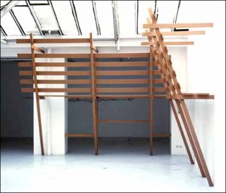 La sculpture (Copie) est adossée au mur de la galerie. C’est une structure d’échafaudage parisien reconstituée en carton. On y retrouve le geste précis et la minutie de l’orfèvre, la contradiction entre la fragilité du matériau et son effet de solidité. La qualité de finition également, la volonté de faire quelque chose qui tient debout, qui s’impose, s’émancipe de son référent sans le trahir.