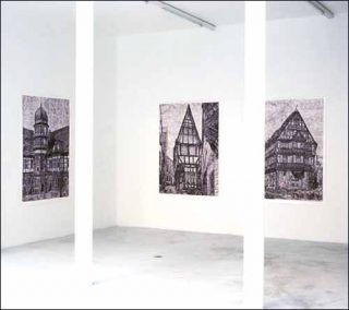 Tout d’abord le son : une musique électronique issue de sons diversement retravaillés, filtrés, répétés, déviés. Une acoustique restructurée à partir d’ambiances préenregistrées. Un ensemble au final composé. Le résultat n’est pas arbitraire ni aléatoire ; en un mot il est musical. On se prend immédiatement à faire des liens avec ce que l’on voit : des images également pré-existantes, des images récupérées et retravaillées. Cartes postales agrandies et photocopiées sur papier glacé et brillant, vue d’architectures de diverses époques, retravaillées au pinceau humidifié. L’encre se dilue, bave légèrement, le motif se défait, mais l’image se maintient. L’effet aquarellé du traitement renvoie l’image vers la peinture qu’elle cite plus ou moins explicitement : impressionnisme, expressionnisme, mais aussi vers les arts graphiques et la gravure. Procédés citationnels par effet secondaire plus que par intention délibérée. Il s’agit plutôt de faire dévier, de réorienter.