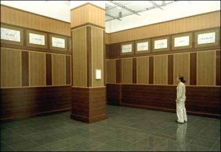 Le décor, façon école des beaux-arts du XIXe siècle, a été réalisé au moyen d’adhésif Vénilia faux bois et fausses plaques de marbre gravées aux noms des artistes ayant exposé dans cette salle avant qu’elle ne soit transférée puis refaite. Cet environnement n’est que la partie émergée d’un dispositif, l’essentiel pour moi est la convention que j’ai passée avec la faculté Panthéon Sorbonne et qui sera votée en conseil d’administration.