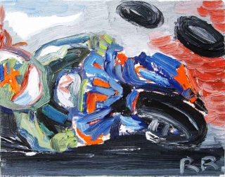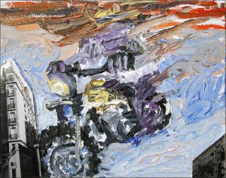 Ses tableaux crissent, on entendrait presque les trépidations de ces roues figées dans leur mouvement, on sentirait la chaleur d’un moteur impatient. Mais on y devine toujours un homme, plus ou moins esquissé, qui fait corps avec la machine, et lui donne sa volonté.