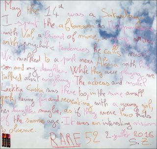 Cent œuvres calligraphiées, des peintures, vidéos, photos et sculptures, sont présentées, qui forment les cent pages du dernier roman de Stéphane Zagdanski. Ce récit autobiographique intitulé Rare transcrit la vie et les pensées quotidiennes d’un écrivain parisien hanté par la question : qu’appelle-t-on écrire ? Le livre se veut le journal intime d’un processus d’écriture ; il raconte la métamorphose subie par Stéphane Zagdanski lui-même au cours de la rédaction de son précédent roman, Chaos brûlant.