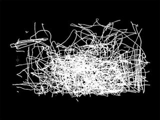Avec la reconstitution en grand format des gestes tirés du film The Misfits de Marilyn Monroe, Pierre Bismuth convoque une pratique du dripping à la Pollock. Des lignes blanches sur fond noir dessinent un parcours pour aveugles, véritable suivi des mouvements d’une main. Placés judicieusement en face, les mobiles de Robert Breer dessinent au sol un parcours; la lenteur de ces machines célibataires invite à anticiper ces formes de dessins automatiques.