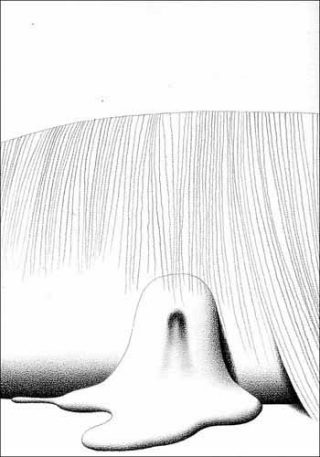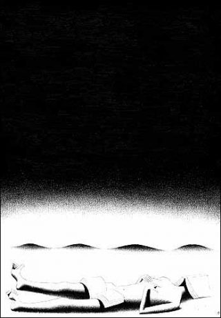Killoffer travaille généralement en noir, à l’encre de Chine, dont il tire parti pour dégager des zones d’ombre très denses laissant les parties en réserve (blanches donc…) décrire une lumière très franche.
