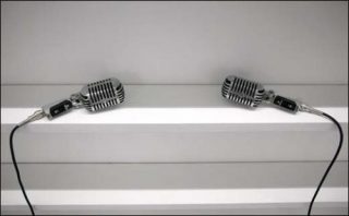 Des sons épars émanent de la première salle. Quelques microphones posés sur des étagères fixées au mur laissent échapper de temps à autre des mots sans suite logique. Semblable à son autre installation Singing Cloud présentée au Laboratoire lors de sa dernière exposition «While I Sleep», l’œuvre prend ici une forme plus épurée qui n’en est pas moins efficace.