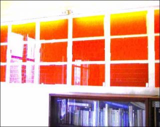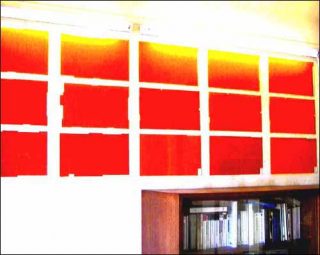 Jérôme Touron part, lui aussi, d’un dialogue avec le lieu. Son travail s’inscrit souvent dans l’architecture. Le panneau présenté ici est incontournable dans son ensemble. Dix-huit plaques de verre monochromes éclairées par deux néons. La lumière et le temps de l’approche révèlent les traces d’un geste répétitif, mais le dessin qui naît de la superposition de l’envers de l’adhésif orange sur le verre n’est jamais identique. Il nous invite à mieux regarder presque à entrer dans chacun de ces territoires.