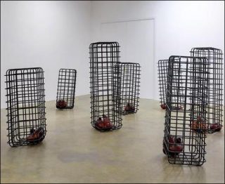 Exilée de Beyrouth depuis la guerre du Liban et séparée dès lors de ses racines palestiniennes et de sa famille, Mona Hatoum exprime ainsi, à travers l’installation Cellules, la profonde aliénation que rencontre tout émigrant, les violences politiques qui frappent les populations dans des zones du globe sujettes à de vives tensions ou à des affrontements. Ces cages d’acier, inflexibles, symbolisent en effet la fatalité qui s’abat, de sa main de fer, sur les êtres. La matière froide et inerte contraste toutefois avec les bulles de verre rouge qu’elle garde prisonnière, comme des matériaux organiques, vivants et malléables.