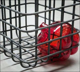 Huit cages d’acier renfermant des bulles de verre rouge ouvrent le parcours de l’exposition et donnent d’emblée la tonalité propre aux œuvres de Mona Hatoum. Reconnue depuis les années 1980 pour ses performances et vidéos mettant à mal son corps, et attirant notre attention sur les souffrances issues de son histoire personnelle, de son exil, et au-delà , des maux du monde, Mona Hatoum s’est depuis tournée vers les installation ou la sculpture, mais sans renoncer à son propos initial: rendre compte coûte que coûte du sentiment de déracinement, d’oppression et de blocage qui l’habite.